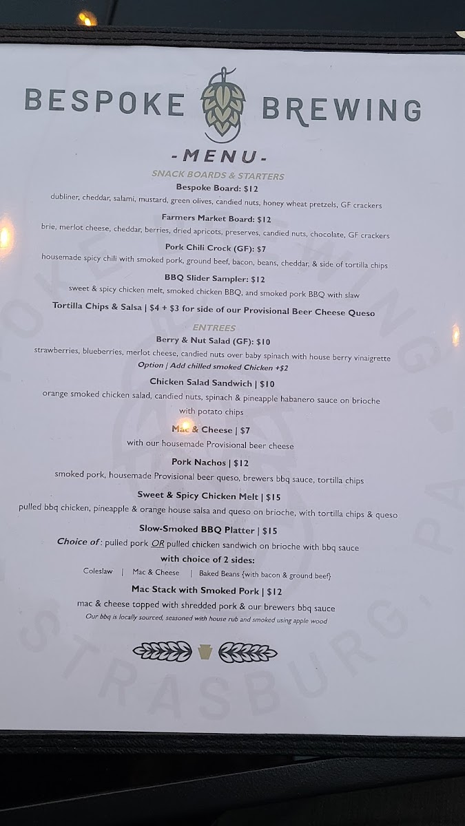 Bespoke Brewing, located in Ronks, PA, exemplifies a chic brewpub experience with its inviting atmosphere and tantalizing menu. Specializing in handcrafted beers, such as the standout Smoked Schwarzbier, it also offers a selection of hearty handhelds like the Blackened Salmon Sandwich and Smoked Pork Sandwich, perfectly complemented by unique sides like bacon jam and sweet tater tots. The venue's decor blends contemporary white and wood elements, making it welcoming for both small groups and solo visitors. With a commitment to quality food and friendly service, Bespoke Brewing is a must-visit for those seeking a memorable dining outing in Lancaster County.